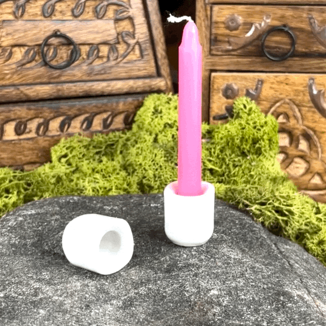 Enkel ljushållare i vit glaserad keramik som fungerar perfekt att använda till ljus som är max 1 cm i omkrets. Mått 3 xm hög och 2,5 cm bred.
