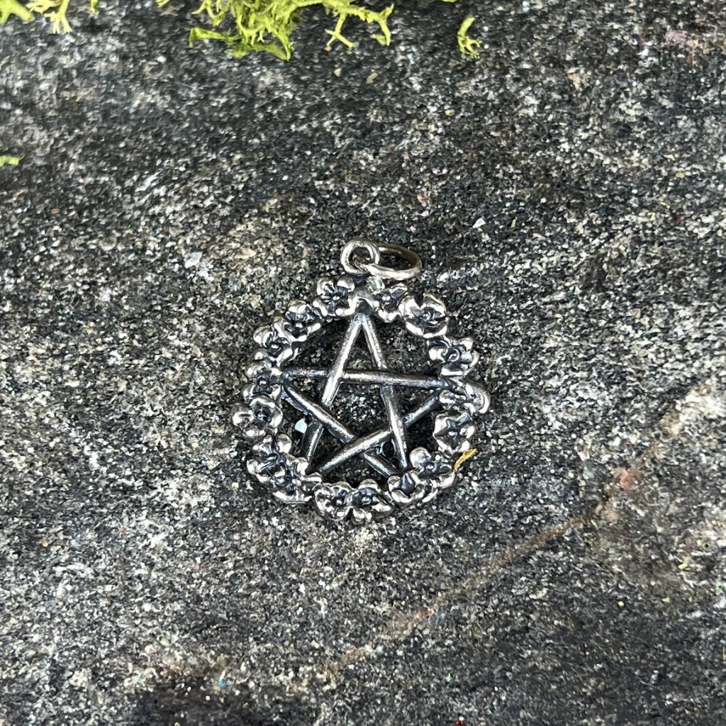 Vackert pentagram med en krans av blommor i silver. ca 2,5 cm